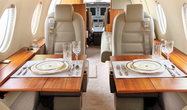 Denna privata jet kan rymma 6 till 7 passagerare. Säteskonfigurationen inkluderar klubbar för fyraatrpassagerare och en soffa för tre.